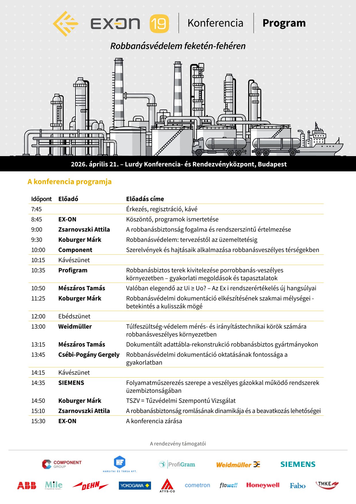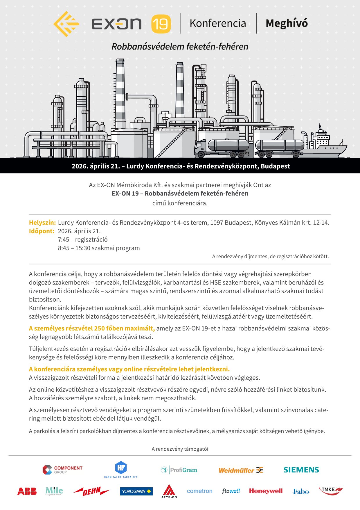 Megkezdődött a regisztráció az EX-ON 19 – Robbanásvédelem feketén-fehéren konferenciára. Az alábbiakban olvashatja a konferenciára vonatkozó meghívónkat és a részletes programot. A jelentkezési lapot ide kattintva tudja letölteni.